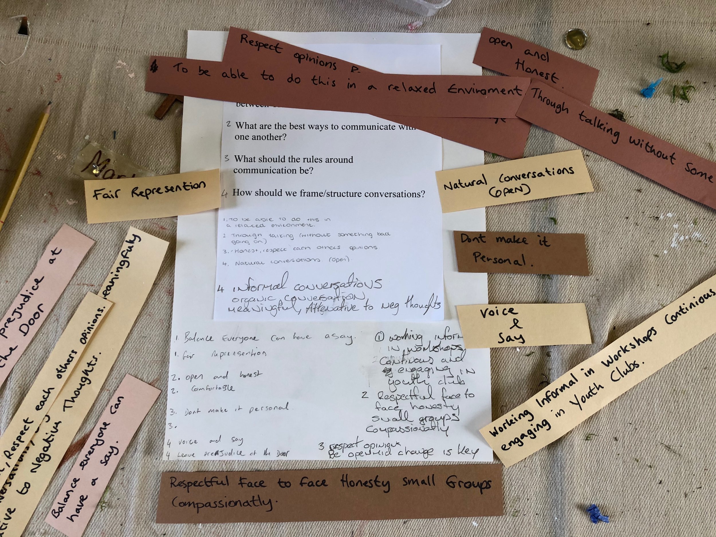 The personalized art pieces were assembled and into a frame that was used to process how we can ‘frame’ challenging conversations. The art is now permanently installed at a central Garda site. The Gardaí filmed this project and now use pieces as part of their sensitivity training throughout Ireland.